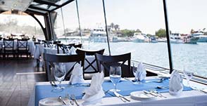 Вы можете поужинать в уникальном плавучем ресторане в Дубае, пришвартованном на частной пристани отеля. На борту шеф-повара готовят щедрый шведский стол с лучшими, свежими морепродуктами, когда вы сидите отдыхаете и наслаждаетесь видами из полноразмерных стеклянных окон.